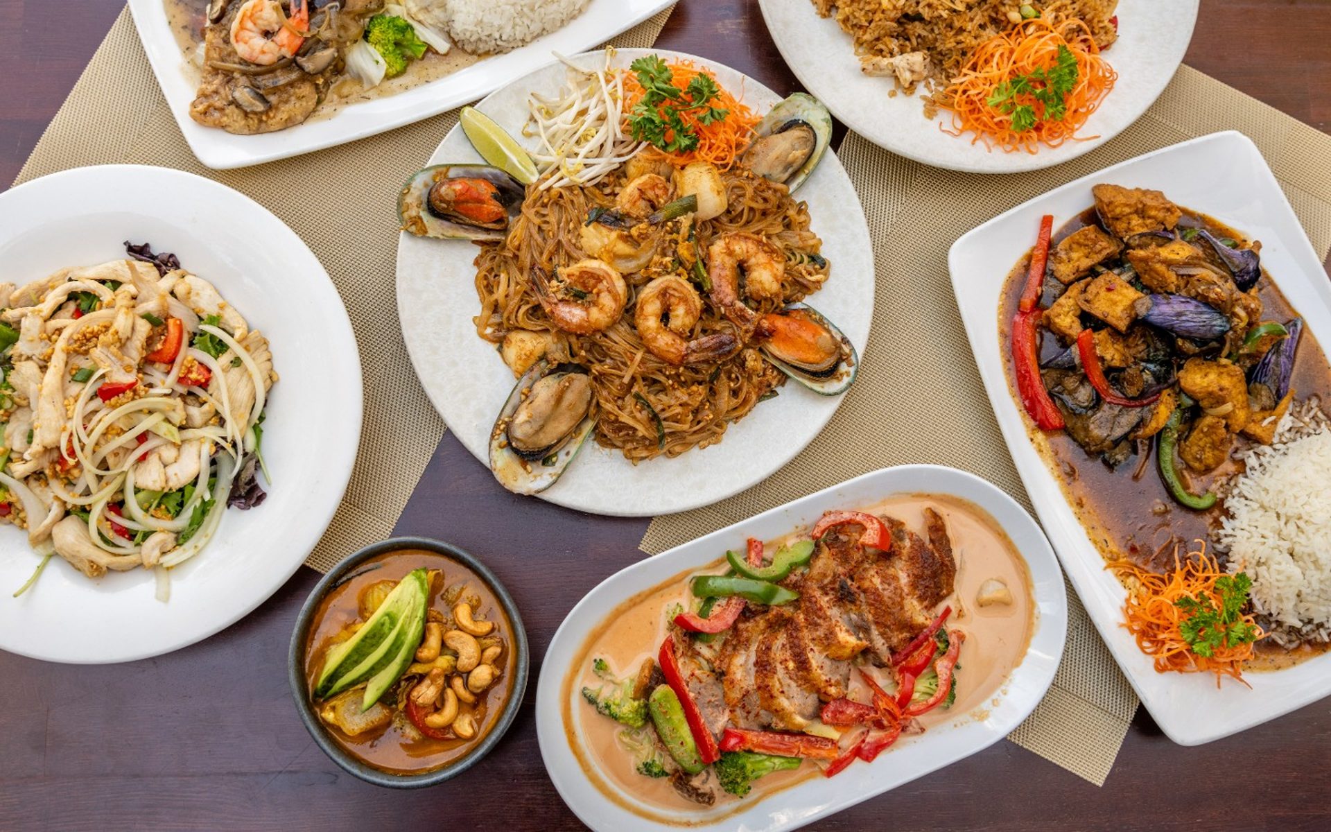 We are known for Spring Rolls, Shrimp, Iced Coffee, Panang Curry, Thai Fried Rice, Curry, Soup, Vegetarian Food, Fried Shrimp, Seafood, Salmon Salad, Satay, Dumplings, Thai, Green Curry, Asian Food, Salmon, Salads, Pad Thai, Fish, Red Curry, Chicken Salad, and Fried Rice